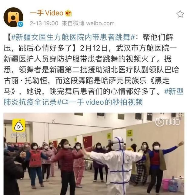 压抑的环境中时,一名援汉的新疆医护人员穿着防护服带领着患者一起跳舞,缓解患者紧张且压抑的心情。