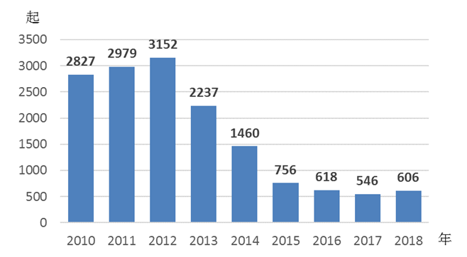 2.打击针对儿童的违法犯罪成效明显。为加强儿童保护、防范和打击拐卖儿童犯罪,我国运用“互联网+打拐”新模式,通过不断完善公安部儿童失踪信息紧急发布平台,取得了良好的法律和社会效果。两年多来,平台累计发布失踪儿童信息3000余条,找回儿童3300多名。近年来,随着《中国反对拐卖人口行动计划(2013—2020年)》深入开展,拐卖儿童犯罪呈现明显下降态势,2018年全国共破获拐卖儿童案件606起,比2015年下降19.8%,比2010年下降78.6%(见图8)。