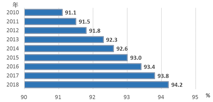 2.义务教育普及程度持续提高。2018年,全国九年义务教育巩固率达94.2%,比上年提高0.4个百分点,持续逼近“达到95%”的《纲要》目标(见图3)。小学学龄儿童净入学率达99.95%,比上年提高0.04个百分点。初中阶段毛入学率为100.9%[1],九年义务教育人口覆盖率已达到100%。