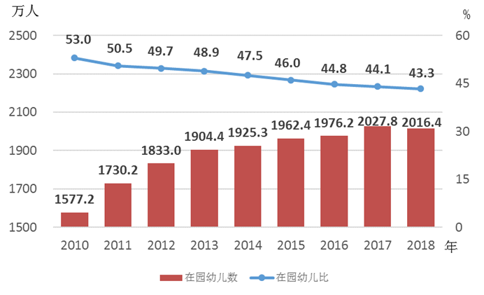 2010年以来,我国公办幼儿园在园幼儿规模稳步扩大。2018年,全国公办幼儿园(包括附设幼儿班)在园幼儿2016.4万人,比2015年增长2.8%,比2010年增长27.9%。虽然公办幼儿园在园幼儿数呈年度上升态势,但占比逐年走低(见图11)。